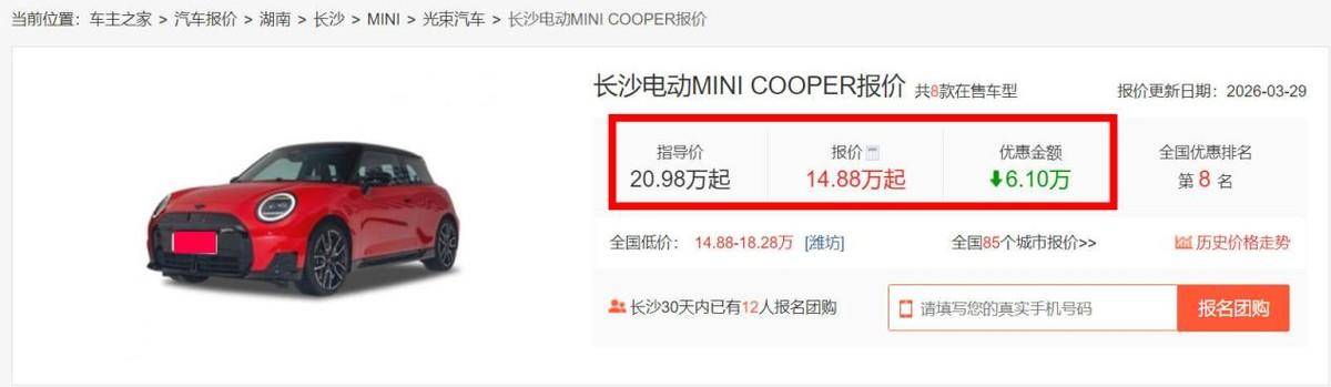 曾几何时,MINI是高高在上的“轻奢玩具”,落地价稳定在25万元以上。而现如今,随着电动MINI COOPER(参数|询价)终端的报价已经跌至14.88万元起,这款纯电小车也瞬间杀入到了比亚迪海豚、大众ID.3等车的腹地。那么,价格下跌近3分之1的电动MINI COOPER,现在究竟值不值得买呢?买它之前又需要搞清楚哪些问题?今天我们一起来探讨和分析分析。