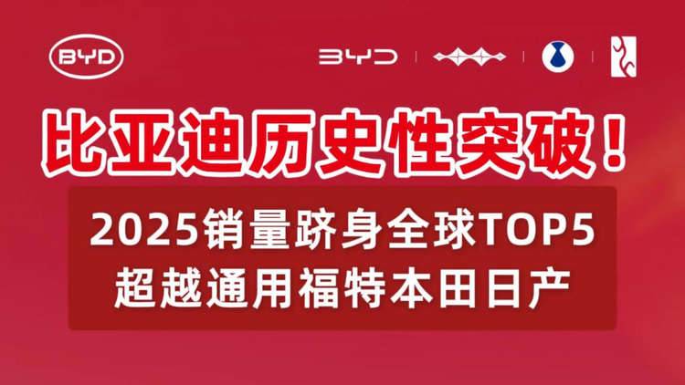 2025 年全球车企销量榜单近日出炉,比亚迪以 460.2 万辆的全年销量,首次跻身全球前五,成功超越通用、福特、本田等老牌车企,成为首个闯入该榜单前五的中国汽车集团。