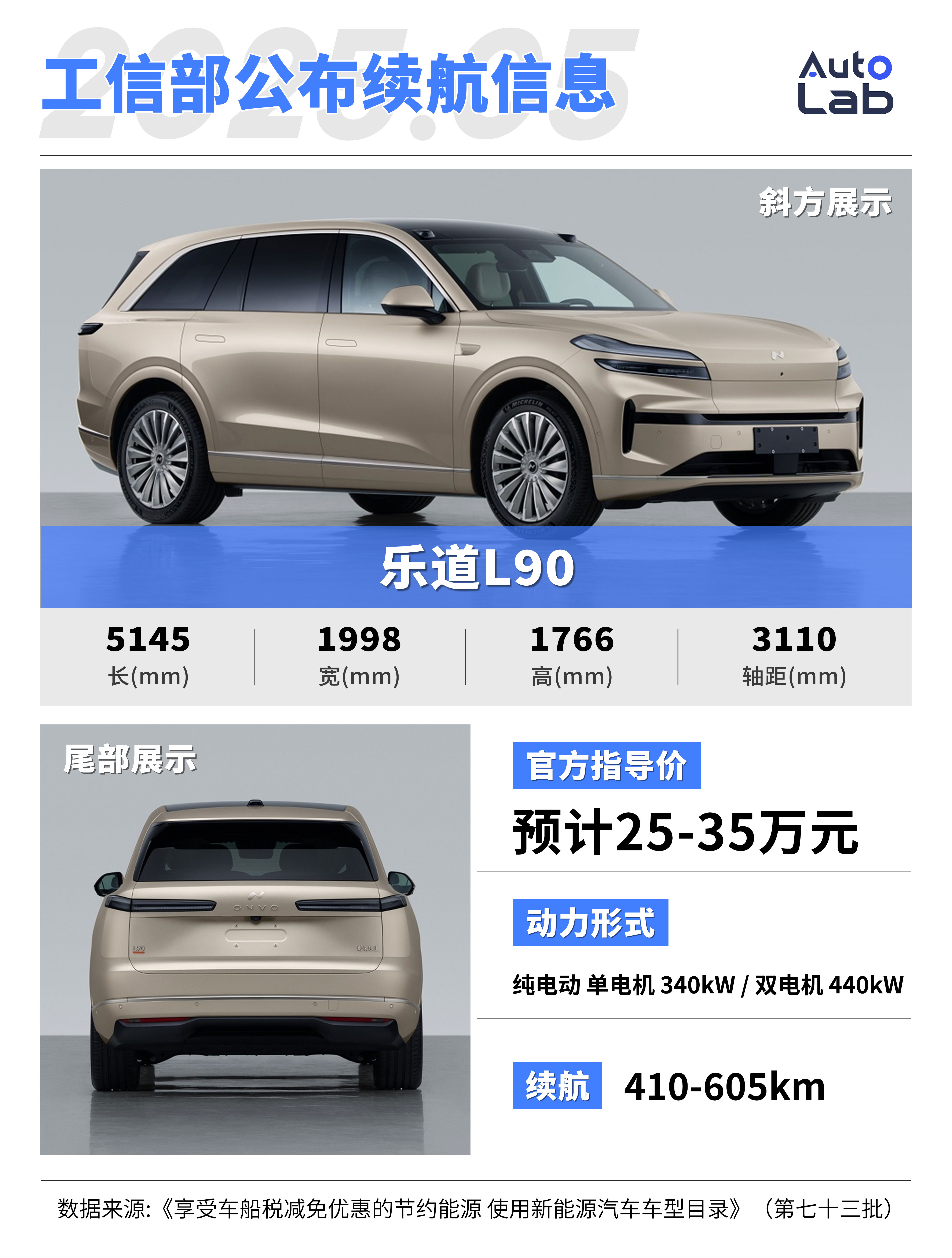 但其实除了这个版本版本外,乐道L90还在工信部一同申报了搭载60.6度小电池的版本,其四驱版本续航里程为410km或425km。