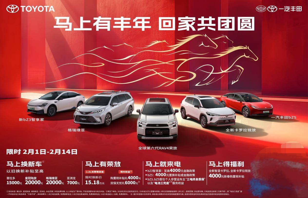 年味渐浓,归途可期。一汽丰田以一份诚挚礼遇,守护每个家庭的团圆之旅。2月1日至2月14日,一汽丰田推出限时活动,皇冠陆放(参数|询价)、格瑞维亚(参数|询价)等明星车型享至高20000元的置换补贴;全新第六代荣放限时焕新价15.18万元起,并可享4000元的购置税补贴和6000元的双保无忧礼;纯电“双子星”bZ3智享家和bZ5至高享4000元购车补贴和“三电终身质保”“电池三兜底”的服务权益;全新智混卡罗拉、全新卡罗拉锐放也可享4000元新春购置税补贴。