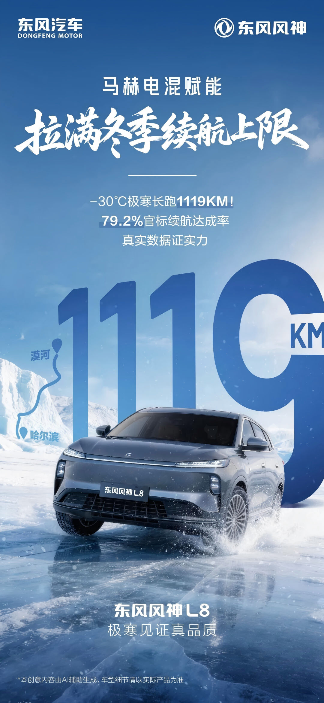 近日,东风风神 L8 极寒续航实测活动在哈尔滨正式收官。东风风神产品线负责人徐斌亲自带队,与东风研发总院整车特性开发中心副总监吴小龙、知名汽车媒体同车见证,历时一天一夜完成从漠河到哈尔滨的长距离极寒挑战。在 - 30℃极端低温、全程开启空调、完全复刻用户日常用车的严苛条件下,风神 L8 最终取得 1119km 的真实续航成绩,续航达成率近 80%,远超行业 60%-70% 的平均水平。这场看似未达 1412km 官标续航的测试,因全程公开透明、场景高度真实,成为风神 L8 真续航实力的最佳佐证,彻底打破新能源车型冬季续航虚标的行业魔咒。