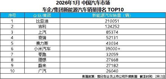 新年伊始,中国新能源汽车市场的竞争轮廓迅速显现,头部车企之间的差距在1月销量榜单中被进一步拉开,分化格局愈发显现。截至2月2日,根据部分车企及上市公司对外披露的数据,比亚迪以超21万辆的新能源汽车销量位居行业首位,继续稳居中国新能源市场头部位置,并在主要车企中拉开明显差距。